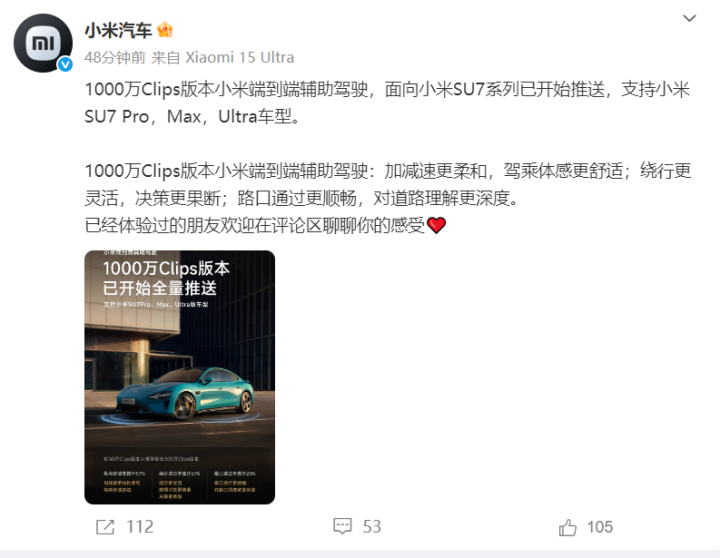 2025年7月29日,@小米汽车宣布:1000万Clips版本小米端到端辅助驾驶,面向小米SU7系列已开始推送,支持小米SU7Pro,Max,Ultra车型。